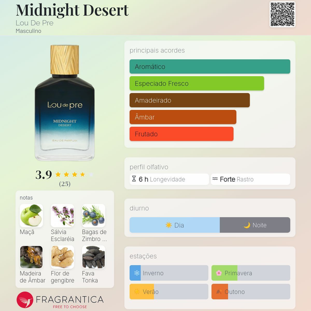 Envolva-se em um mistério encantador com Midnight Desert, uma fragrância criada para aqueles que exploram o mundo com confiança e curiosidade. As notas vibrantes de gengibre, maçã e bergamota te transportam para um deserto noturno mágico, onde cada sopro de ar carrega uma história. Nas notas de corpo, zimbro e gerânio trazem uma harmonia suave e tranquilizante, enquanto as notas de fundo de olíbano e cedro guiam seus sentidos em uma jornada de força e esperança. Midnight Desert é um conto olfativo, perfeito para quem deseja carregar consigo uma aura de mistério e sofisticação.
